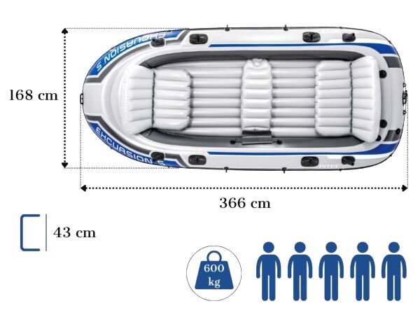 İntex Şişme Bot Ebatları (366 x 168 x 43 cm) boyutlarındadır. 5 Kişinin rahat bir şekilde kullanabileceği şekilde üretilmiştir.